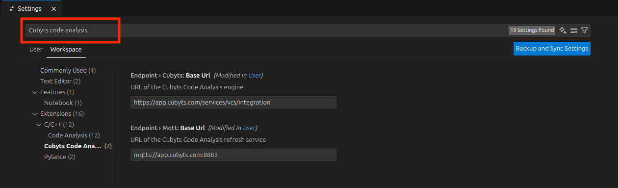 Step 1: Go to VS Code and open VS Code settings and search for “Cubyts code analysis” as shown in the image below: